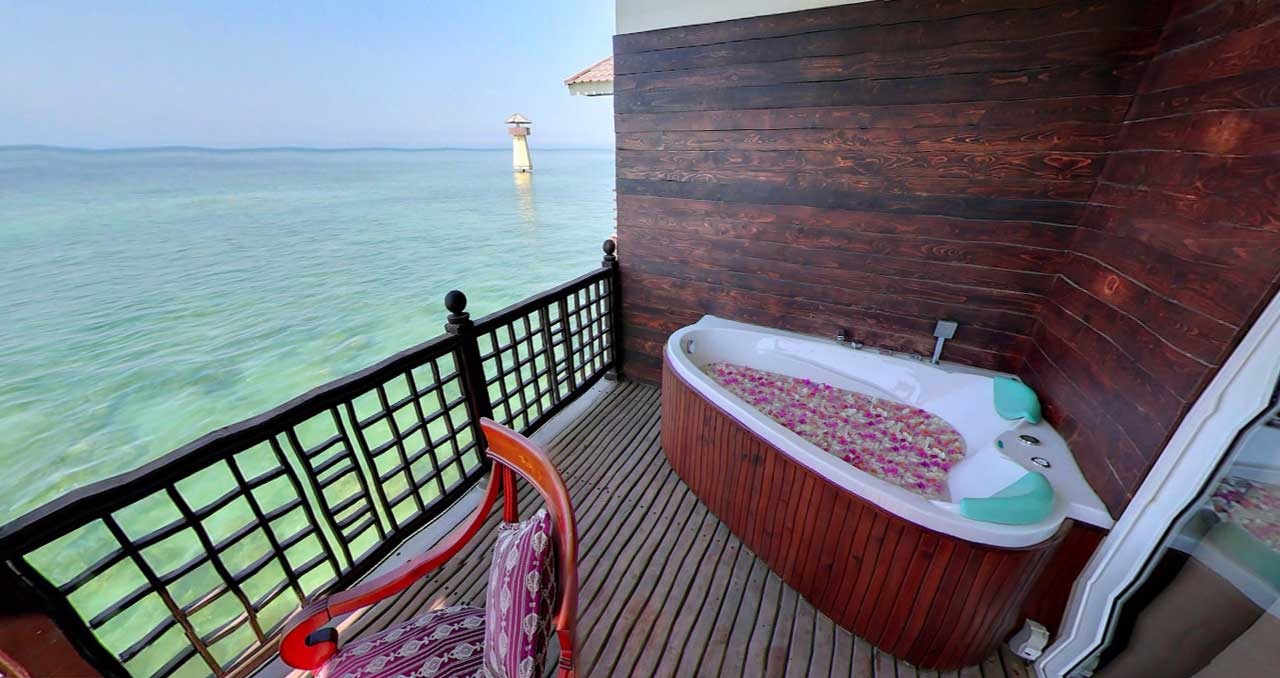 تمام سوئیت‌ها از طریق اسکله چوبی به لابی و سایر قسمت‌های هتل متصل هستند و نمای ۱۸۰ تا ۳۶۰ درجه از خلیج فارس ارائه می‌دهند.