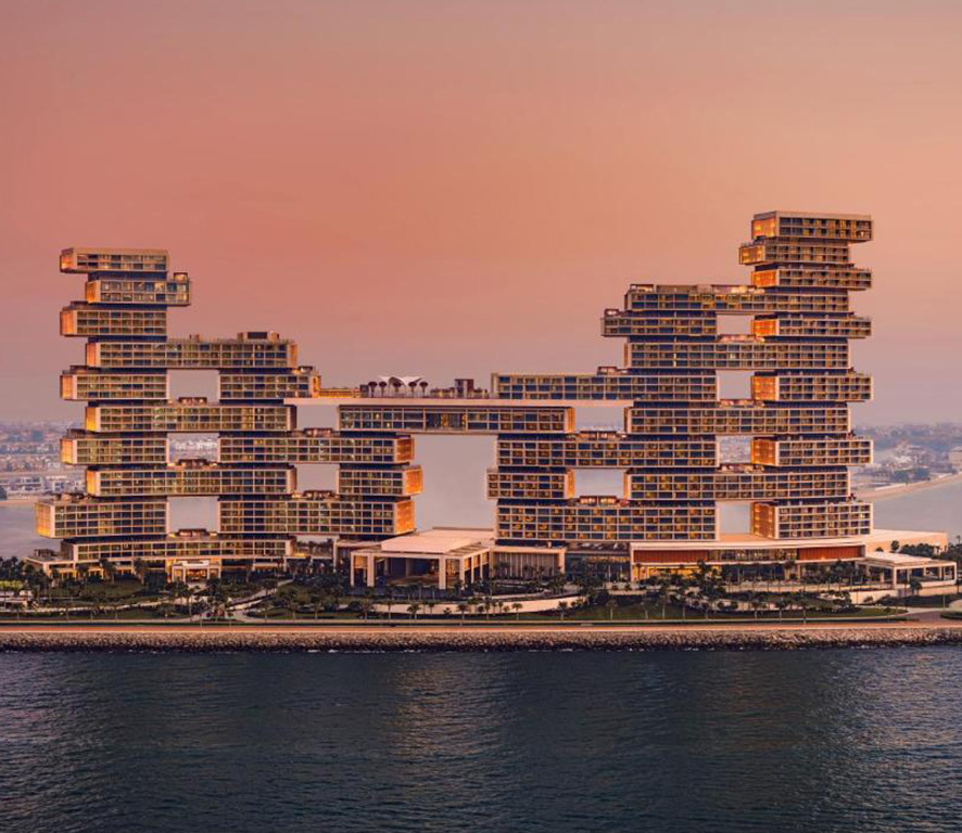 هتل Atlantis The Royal تنها یک اقامتگاه نیست؛ بلکه بنایی است که مرزهای معماری مدرن را به چالش میکشد و شکوهی از طراحی هنری را به نمایش میگذارد. این ساختمان با خطوط هندسی جسورانه و ساختاری چندلایه، همچون جواهری درخشان در جزیرهی Palm Jumeirah میدرخشد. هر زاویه از این هتل، داستانی از نوآوری، خلاقیت و هماهنگی میان طبیعت و تکنولوژی را روایت میکند. ساختمان این هتل، با الهام از سازههای مدرن و هنر معماری عربی، همچون مجسمهای زنده به نظر میرسد. برجهای متصل با پلهای معلق و ساختارهایی که به نظر میرسد در هوا شناورند، حسی از بیوزنی و آزادی را تداعی میکنند. در بالاترین نقطه، استخر آسمانی معروف هتل، همانند نگینی درخشان، منظرهای نفسگیر از خلیج فارس و افق دبی را به نمایش میگذارد. ورودی اصلی هتل با استفاده از مواد طبیعی مانند سنگهای مرمر و طراحیهایی از جنس شیشه و فلز، شکوهی از تجمل و آرامش را ارائه میدهد. اینجا جایی است که نور طبیعی به زیبایی در سراسر فضا منعکس میشود و محیطی گرم و دعوتکننده را ایجاد میکند. فوارههای نمایشی و آثار هنری مدرن که در سراسر هتل به چشم میخورند، به این فضا زندگی و حس حرکت بخشیدهاند.