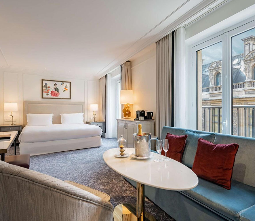 Hôtel du Louvre  با ارائه 164 اتاق بزرگ و نورگیر، شامل 57 سوئیت با طراحی خاص پاریسی، تجربه‌ای بی‌نظیر از اقامت لوکس را در قلب پایتخت فرانسه فراهم می‌کند. اتاق‌های این هتل با طراحی منحصربه‌فرد و فضایی آرامش‌بخش، مجهز به امکانات مدرنی مانند تلویزیون ماهواره‌ای، مینی‌بار و اینترنت پرسرعت رایگان هستند. برخی از اتاق‌ها نیز با نمایی چشمگیر از لوور یا دیگر نشانه‌های شاخص پاریس، تجربه‌ای رؤیایی را برای مهمانان رقم می‌زنند. یکی از گزینه‌های جذاب برای اقامت، Junior Suite View است که با مساحت 35 مترمربع، فضایی روشن و دلباز دارد. این سوئیت شامل یک اتاق خواب با تخت کینگ و یک نشیمن بزرگ با مبل راحتی است و چشم‌انداز منحصربه‌فردی به بناهای تاریخی پاریس ارائه می‌دهد. برای سفرهای خانوادگی، Family Suite with a View  با مساحت 40 مترمربع و طراحی دلنشین مناسب است. این سوئیت‌ها دارای یک اتاق خواب اصلی با تخت کینگ، یک حمام مرمرین و اتاقی مجزا با تخت‌خواب‌های دوطبقه جذاب هستند. سوئیت‌های Louvre  با مساحت 50 مترمربع و نور طبیعی فراوان، سبک کلاسیک پاریسی را به زیبایی به نمایش می‌گذارند. این سوئیت‌ها شامل یک اتاق خواب با تخت کینگ و یک نشیمن جداگانه هستند که چشم‌اندازی فوق‌العاده به موزه لوور و Palais Royal  دارند. همچنین، Palais Royal Suite  با طراحی باز و فضایی به مساحت 50 مترمربع، گزینه‌ای ایده‌آل برای کسانی است که به دنبال فضایی لوکس با نور طبیعی و چشم‌اندازی منحصربه‌فرد از موزه لوور و Palais Royal هستند. این سوئیت‌ها شامل اتاق خوابی با تخت کینگ و فضای نشیمن، به همراه حمامی مجهز به وان یا دوش هستند. در نهایت، Suite Empire با مساحت 75 مترمربع، تجربه‌ای بی‌مانند از اقامت در پاریس را ارائه می‌دهد. این سوئیت بزرگ شامل دو اتاق خواب، یکی با تخت کینگ و دیگری با دو تخت توئین است که هر دو با بالکن‌هایی زیبا به یک نشیمن مشترک و بزرگ متصل می‌شوند. این سوئیت همچنین دارای حمام‌های اختصاصی برای هر اتاق است و نمای بی‌نظیری به موزه لوور دارد.