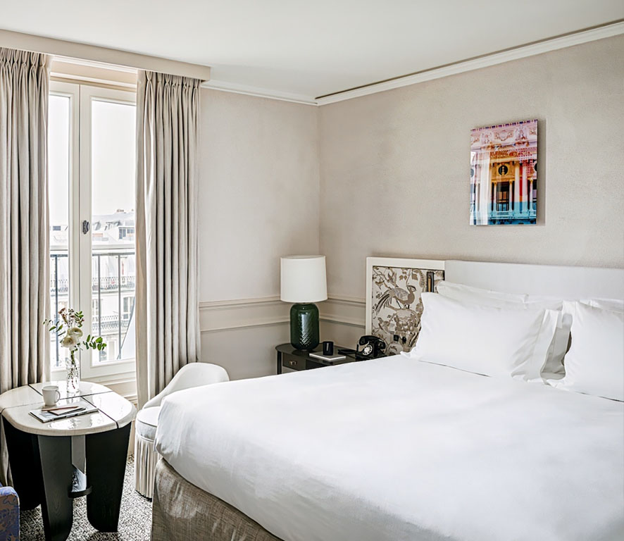 این هتل پنج ستاره با فضای داخلی منحصر به فرد خود که به سبک آپارتمان‌های Haussmannian طراحی شده، شما را در دل پاریس قرار می‌دهد. اتاق‌ها و سوئیت‌های هتل، ترکیبی از راحتی و شکوه فرانسوی هستند و به شما امکان می‌دهند که تجربه‌ای شیک و دلنشین از زندگی پاریسی داشته باشید. هر یک از اتاق‌ها و سوئیت‌ها با امکاناتی مدرن نظیر تلویزیون با سیستم Chromecast، تخت‌های Sofitel MyBed، و تجهیزات قهوه‌ساز Nespresso  برای راحتی شما آماده شده‌اند. اتاق‌های Luxury  با مساحت ۲۵ مترمربع، نمایی از خیابان‌های بزرگ پاریس یا حیاط داخلی دارند و فضایی کامل برای استراحت و لذت از زندگی پاریسی ارائه می‌دهند. در حالی که سوئیت‌های Premium Junior  با طراحی اختصاصی از سوی Atelier Tristan Auer، با اتاق نشیمن و اتاق خواب جداگانه و سرویس بهداشتی شیک، تجربه‌ای راحت و خاص را برای مهمانان فراهم می‌کنند. برای تجربه‌ای لوکس‌تر، Opera Duplex Suite  با مساحت ۹۵ مترمربع، نمایی بی‌نظیر از زندگی پاریسی و امکاناتی چون MyBed، سرویس ۲۴ ساعته، و تراس خصوصی، فضایی ایده‌آل برای اقامتی ویژه در قلب پاریس است. برای لذت از فضای باز و ویوی خیره‎کننده، Terrace Suite در طبقه بالا با تراس خصوصی ۲۰ مترمربعی، فضایی عالی برای تجربه پاریس به شیوه‌ای منحصر به فرد فراهم می‌آورد. این سوئیت با نمایی آرامش‌بخش از حیاط داخلی، بهترین گزینه برای کسانی است که به دنبال سکوت و خصوصی بودن در کنار راحتی لوکس هستند.